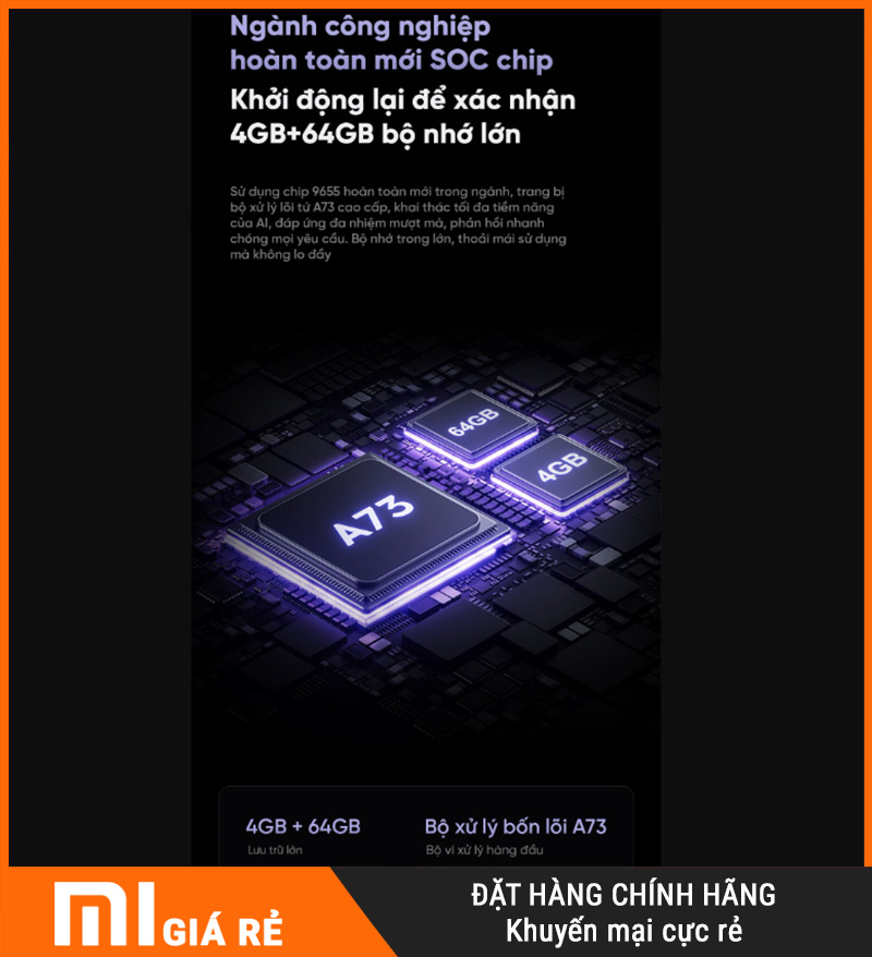 Trang bị chip Cortex A73 bốn nhân kết hợp GPU Mali-G52 (2EE) MC1, RAM 4GB và bộ nhớ trong 64GB: