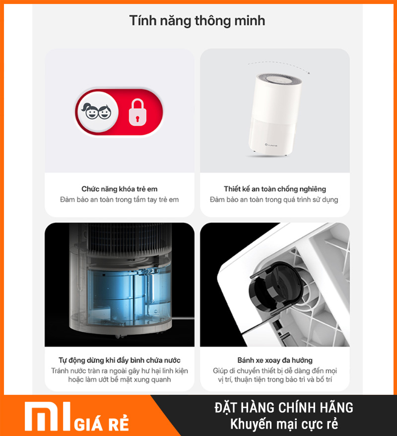 Đặc biệt, máy trang bị bánh xe linh hoạt, giúp di chuyển nhẹ nhàng giữa các phòng—rất tiện khi bạn muốn “xử lý ẩm theo điểm” (phòng ngủ ban đêm, phòng khách ban ngày, khu phơi đồ khi cần).
