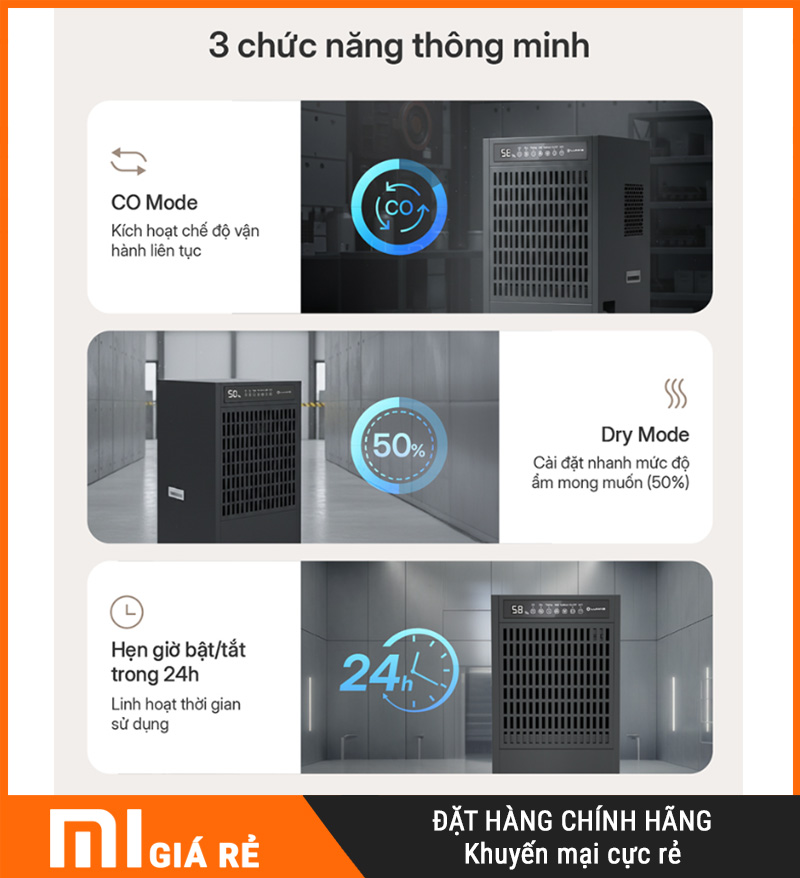 | Chế độ hoạt động | ① CO – Chạy liên tục② Dry – Tự động duy trì độ ẩm 50%③ Hẹn giờ bật/tắt 24 giờ |