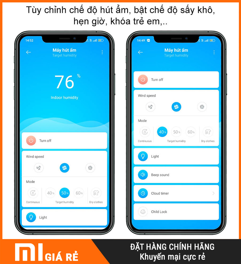 Tùy chỉnh độ ẩm mục tiêu: Có thể chọn mức độ ẩm mong muốn từ 40% đến 70%