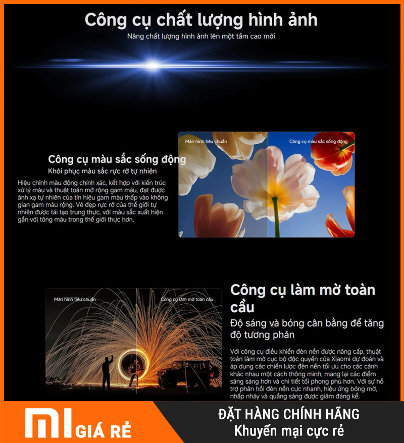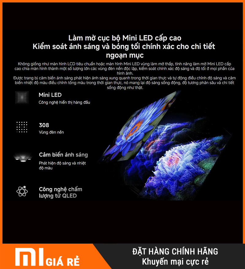 Một trong những yếu tố làm nên chất lượng hiển thị nổi bật của Tivi Xiaomi S Mini LED 55 inch 2026 chính là công nghệ Mini LED với 308 vùng sáng. Nhờ khả năng chia nhỏ vùng kiểm soát ánh sáng, màn hình có thể xử lý tốt hơn sự tương phản giữa các vùng sáng và vùng tối trong cùng một khung hình.