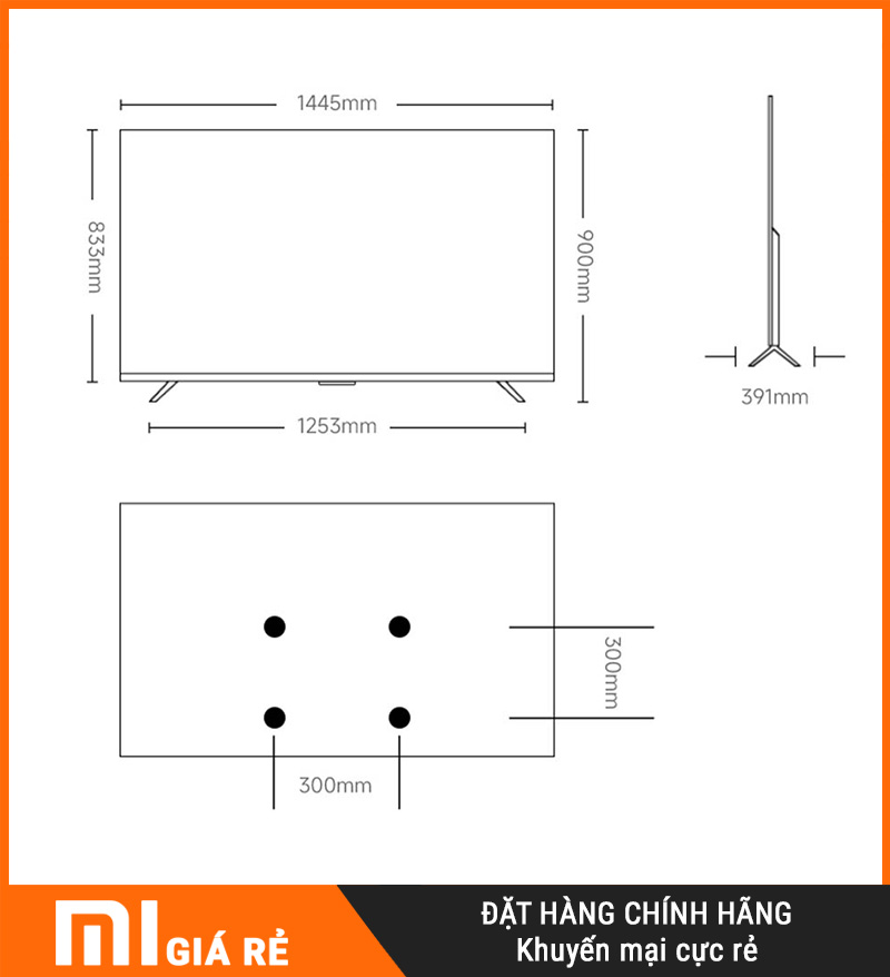 | Kích thước (không chân đế) | 1445 x 77 x 833 mm |