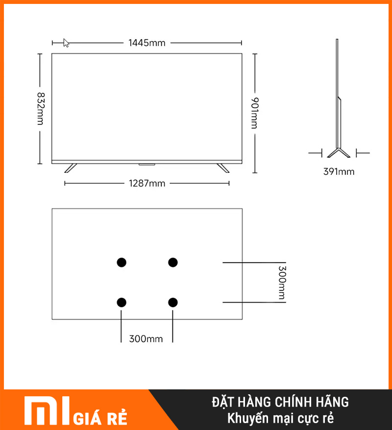 | Kích thước không gồm đế (D × R × C) | 1445 x 81 x 832 mm |
