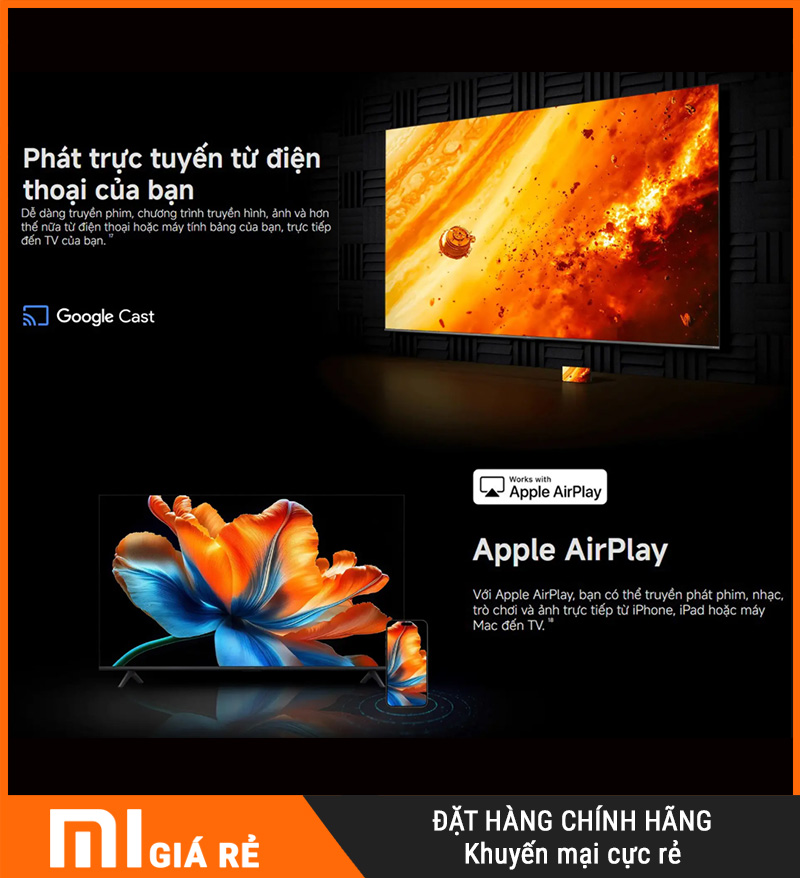 Bên cạnh hệ sinh thái Google, Tivi Xiaomi S Mini LED 65 inch 2026 còn hỗ trợ Apple AirPlay, giúp người dùng iPhone, iPad và MacBook truyền tải nội dung lên màn hình lớn dễ dàng.