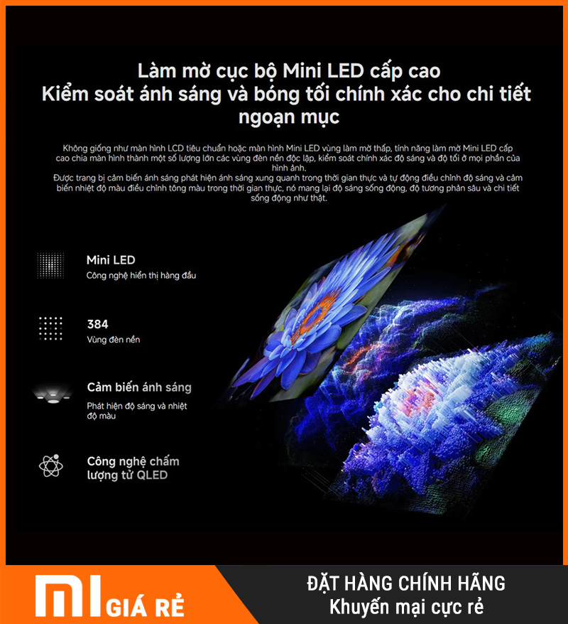 Một trong những điểm nổi bật nhất của Tivi Xiaomi S Mini LED 65 inch 2026 là công nghệ Mini LED với 384 vùng sáng. Đây là công nghệ hiển thị cao cấp giúp chia hệ thống đèn nền thành nhiều vùng kiểm soát riêng biệt, từ đó tối ưu cách phân bổ ánh sáng trong từng khung hình.