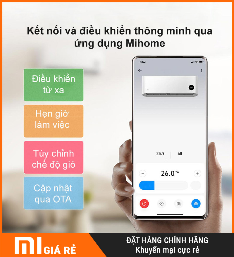 Với khả năng kết nối qua Wi-Fi, điều hòa có thể điều khiển từ xa bằng ứng dụng Mi Home trên điện thoại. Dù bạn đang ở văn phòng, ngoài đường hay đang nằm trên giường, chỉ cần vài thao tác là đã có thể điều chỉnh nhiệt độ, chọn chế độ hoạt động hoặc hẹn giờ bật/tắt theo nhu cầu. Đây là tính năng đặc biệt tiện lợi trong hệ sinh thái nhà thông minh mà Xiaomi đang phát triển.