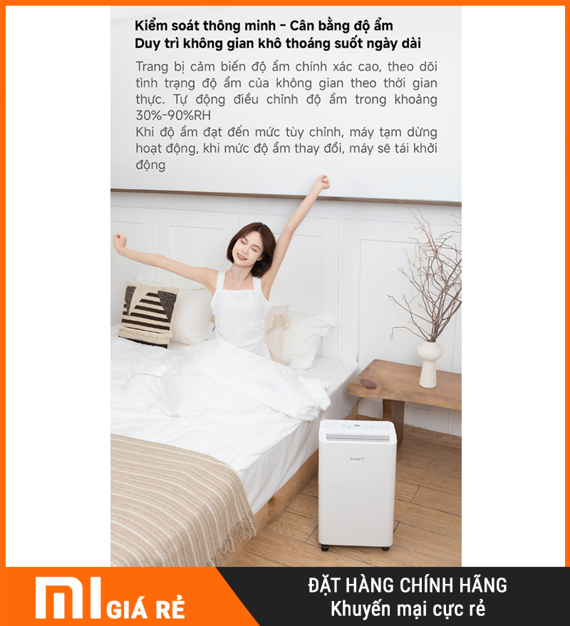 Thông minh – dễ kiểm soát độ ẩm: có thể cài độ ẩm mục tiêu 30%–90%, máy tự vận hành theo nhu cầu.