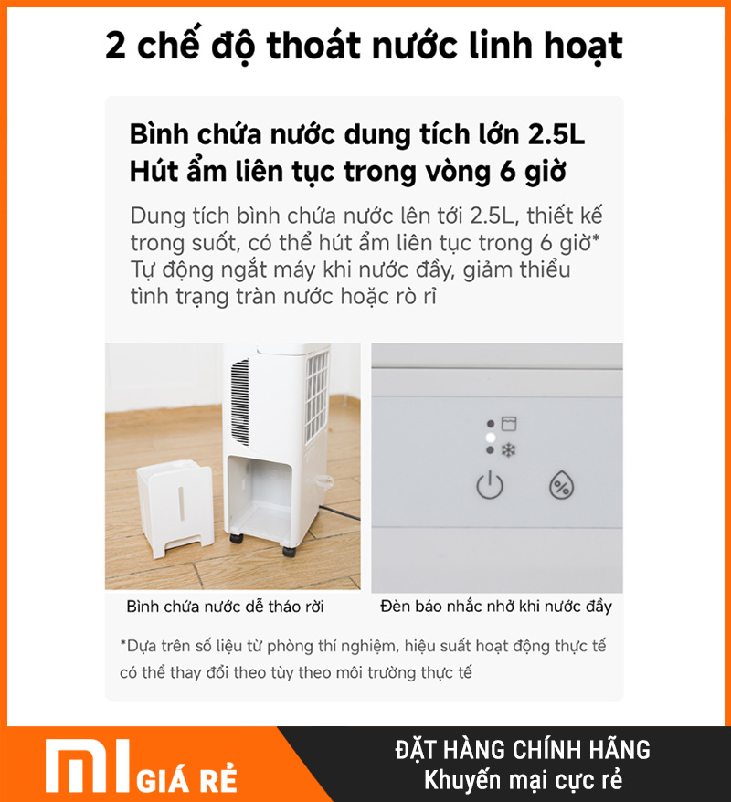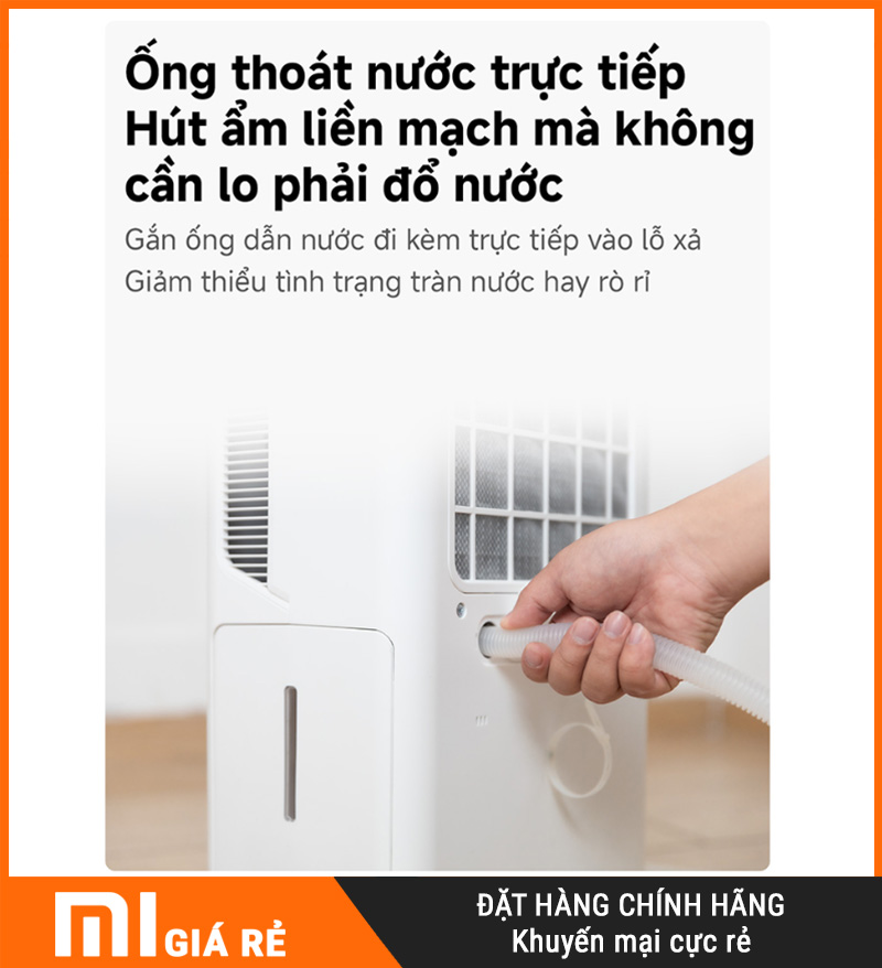 Xả liên tục bằng ống thoát nước 1m: rất hợp mùa nồm/mưa kéo dài, không phải canh đổ nước, tiện khi hong quần áo hoặc chạy nhiều giờ liên tục.