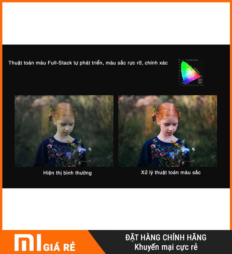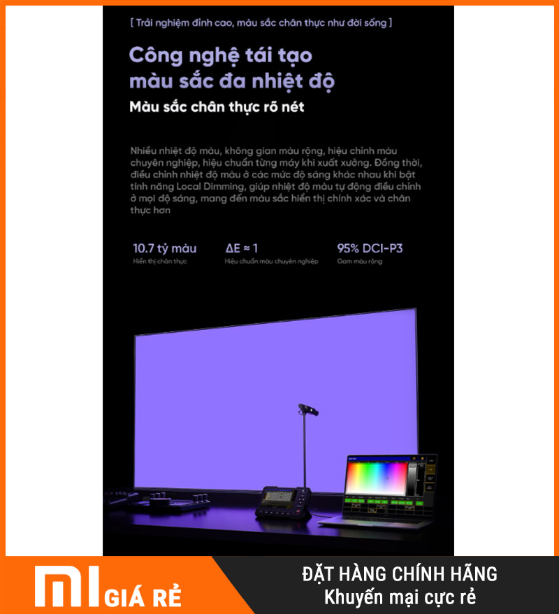 Hỗ trợ gam màu rộng DCI-P3 94%, tivi tái hiện màu sắc rực rỡ và chính xác. Đặc biệt, Xiaomi đã hiệu chỉnh để đạt độ sai lệch màu ΔE≈1, nghĩa là gần như không thể nhận thấy sự khác biệt giữa màu hiển thị và màu thực tế bằng mắt thường.