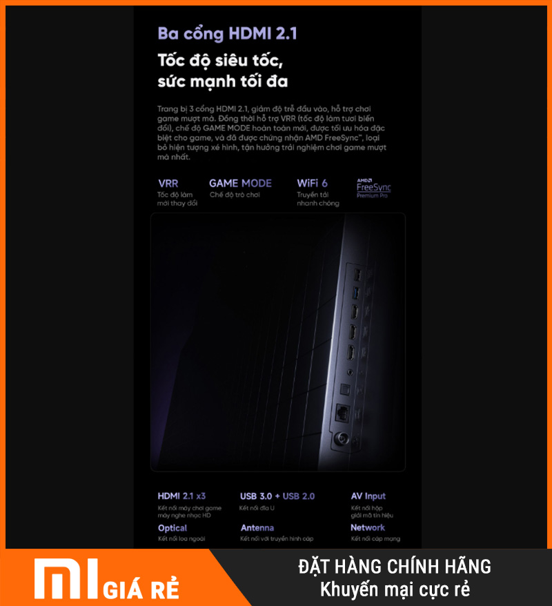 Tivi được trang bị 3 cổng HDMI, trong đó có 2 cổng HDMI 2.1 hỗ trợ eARC, VRR (tần số quét biến thiên) và ALLM (chế độ tự động tối ưu cho game).