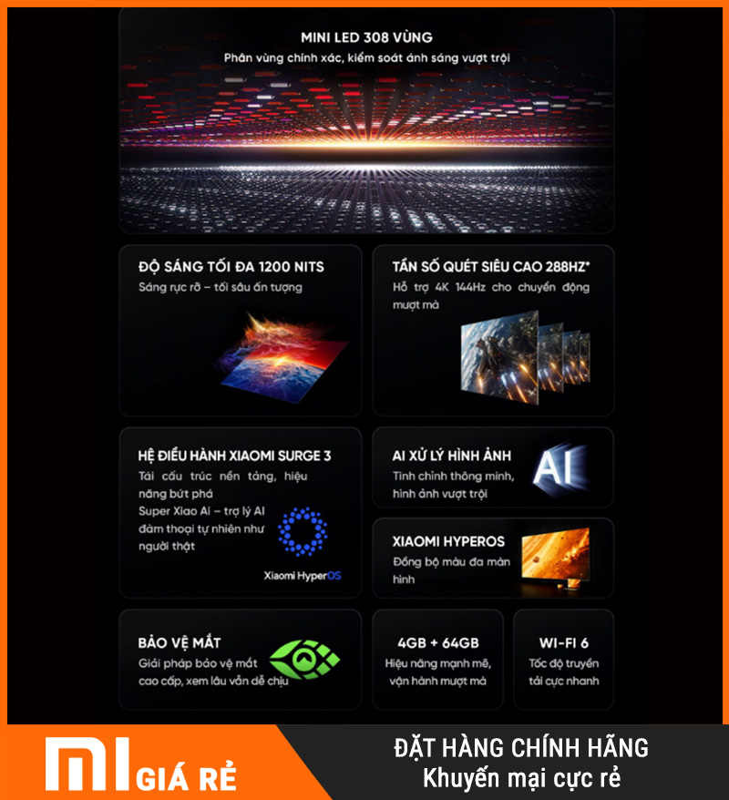 Xiaomi Redmi X75 MiniLED 2026 (RAM 4GB/ROM 64GB, độ sáng 1200 nits) là mẫu TV “đánh vào trải nghiệm nhìn” cho gia đình: phim ảnh đã mắt – thể thao mượt – game phản hồi nhanh – dùng lâu không ì.